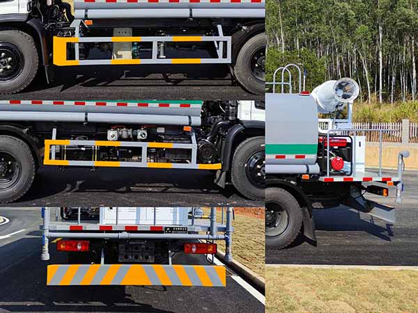 | 仅选用3800mm轴距;罐体外形长轴锥讨嶙长度(mm):2260?300?500,罐体有效容积:9.3立方米;该车有4种配置:A(标配)、B(选装前自动水炮)、C(选装大平台)、D(选装大平台+前自动水炮)。 各配置整车长度(mm)/前悬(mm)/整备质量(kg)/载质量(kg)/接近角(?对应关系如下:配置A:7030/1200/5270/6525/17;配置B:7595/1765/5270/6525/14;配置C:7030/1200/5015/6780/17;配置D:7595/1765/5015/6780/14;侧防护及后部防护装置的材料材质:Q235B;连接方式为螺栓连接;后部防护装置的断面尺寸(宽赘?mm:60?30;后部防护装置的离地高度445mm。可选装:1、后上喷雾装置;2、后下喷雾装置;3、自制洗车枪;4、左右侧浇花装置;5、后部作业指示灯;6、选装后侧鸭嘴;7、选装另一种后洒水;8、选装前鸭嘴;9、球阀;10、气控球阀;11、右侧浇花;12、气动切断阀;13、中对冲;14、后部外观。以上14种选装配置引起的重量及整车尺寸变化可以忽略不计。随底盘选装前面罩、保险杠。ABS型号及生产厂家为:3631010-C2000/东科克诺尔商用车制动系统(十堰)有限公司,J ABS/焦作博瑞克控制技术有限公司。该车装备有罐体,水泵,管道系统,喷雾系统等,用于清洗路面,对路面喷洒水降尘和降低空气中的灰尘,雾霾等作用。 |