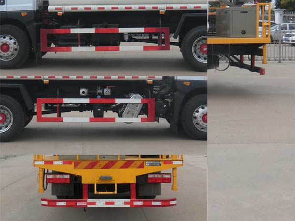 侧防护采用冷弯型钢/Q235,螺栓连接。后防护采用冷弯型钢/Q235,焊接连接。后防护截面高度尺寸120mm,截面宽度尺寸50mm,下边缘离地高度450mm。ABS系统生产厂家,型号 :焦作博瑞克控制技术有限公司,J ABS。该车用途为抑尘降霾,主要装置为水罐及喷雾装置。采用4500mm,4700mm轴距底盘,车辆长与轴距一一对应。额定载质量和整备质量及驾驶室准乘人数一一对应。选装外观及附件位置。选装喷雾装置。 |