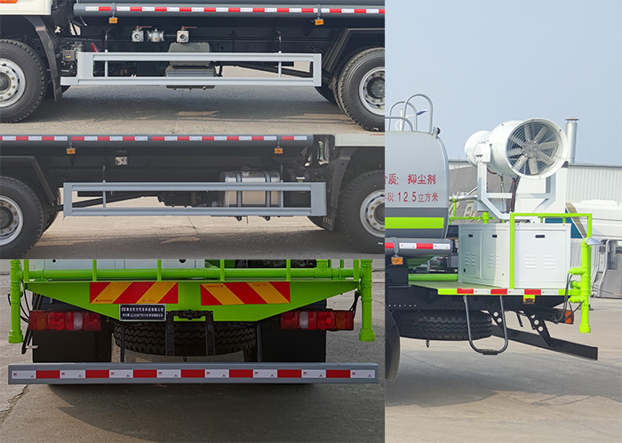 1、该车专用装置为罐体、喷雾装置,主要用于城市街道的喷雾抑尘,罐体外形尺寸(总长卓碜高)(mm):5150?300?400,罐体总容量13.13立方米,有效容积12.5立方米。2、侧/后防护材料为Q235,侧防护采用螺栓连接,后防护采用焊接连接,后防护截面尺寸:120?0mm,下边缘离地高:500mm。3、整车长/前伸对应关系为:8800/0、9000/200、9400/600;仅采用4700,4500mm轴距底盘,ABS型号:446 004 6300;ABS生产企业:采埃孚商用车系统(青岛)有限公司。4、选装限速装置,限速装置限速(km/h):89,选装驾驶室样式及无前置电动水炮结构,选装喷雾机样式,选装前置喷洒结构,随底盘可不选装遮阳罩、选装昼间行驶灯、选装油浴式空滤器、选装保险杠外观、选装高位保险杠、选装踏步、选装前拖钩、选装车道偏离报警和车辆前向碰撞预警系统、选装四方位影像系统、选装前面罩、选装踏步和侧翼子板配色、选装A柱护罩配色。 |