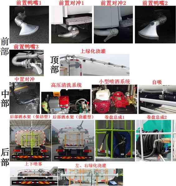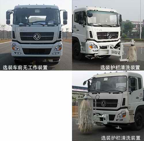 该车仅选用4350+1350mm轴距, 罐体有效容积13.65立方米,罐体外形尺寸(长轴锥讨嶙长度)(mm):2260?310?110.介质名称:水.密度:1000千克/立方米. 选装配置方式有如下几种情况:A,基本型(驾驶室前无工作装置);B,配装喷水架;C,配装护栏清洗装置.选装A,B,C时,整备质量为11870kg,最大总质量为25000kg.选装A时,整车长度为9640mm,前悬1480mm,后悬2460mm;选装B时,整车长度为10420mm或10490mm,前伸为780mm或850mm;选装C时,整车长度为10280mm或10395mm,前伸为640mm或755mm.选装A,B,C时整车高3125mm.可选装鸭嘴、对冲、后部保洁型、后部浇灌型、上绿化浇灌、左右绿化浇灌照片、上下喷雾、自吸、卷盘、小型喷洒系统、高压清洗系统等装置,该系列选装对于整车尺寸、重量变化可忽略不计.侧面防护装置的材料材质为铝合金,连接方式为螺栓连接;后防护装置的材料材质为Q235A,连接方式为螺栓连接,后部防护装置的断面尺寸为240?0毫米,离地高度为540毫米;随底盘选装驾驶室外观.随底盘装ABS,ABS型号/企业:3631010-C2000/东风电子科技股份有限公司制动系统公司. |