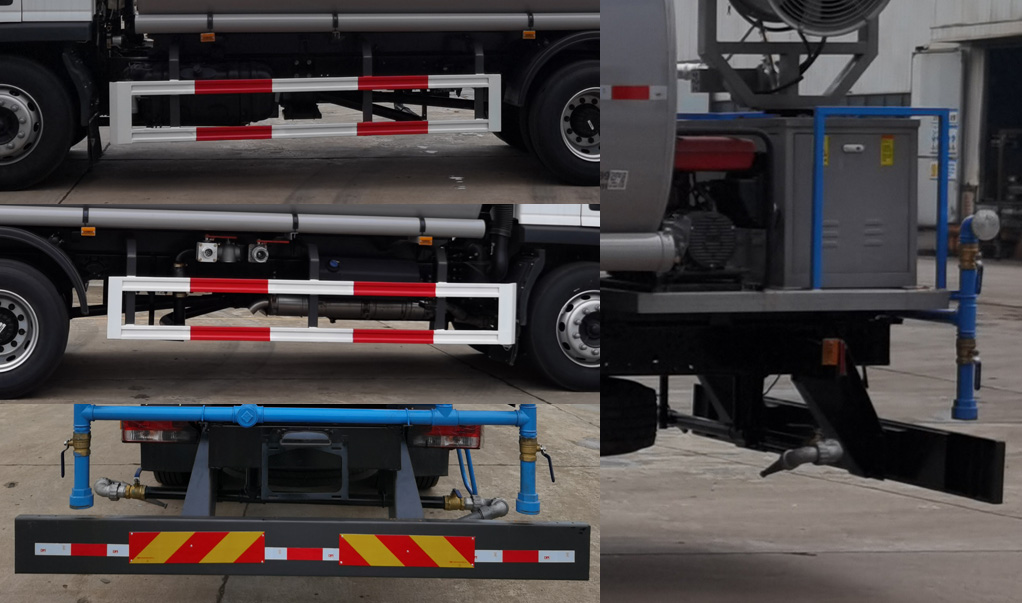 选用4500mm底盘轴距;该车主要用于除霾和降尘,主要专用装置为储液箱及喷雾装置;该车标配时,整车长8930mm,前悬1515mm;选装前自动水炮时,整车长9330mm,前悬1915mm,该车可选装前自动水炮,上绿化浇灌,自吸加水口,对冲安装位置,气动切断阀,箭头灯,卷盘,罐体封头;罐体外形尺寸(长轴锥讨嶙长度)(mm):2400?420?000,罐体有效容积11.8立方米;侧护材料为Q235A,连接方式螺栓连接,后防护材料为Q355B,连接方式为螺栓连接,后部防护装置断面尺寸为240?5mm,离地高度为465mm;随底盘装有ABS,ABS型号/生产厂家:CM4XL-4S/4M/广州瑞立科密汽车电子股份有限公司.随底盘选装驾驶室外观格栅和LOGO。 |