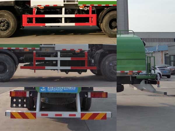 该车侧面,后部均安装有车身反光标识.1、运输介质为水,密度:1000千克/立方米,2、罐体有效容积:12.75立方米;3、罐体外形尺寸(长/长轴/短轴)(mm):5700/2300/1450;4、文字图案喷涂位置和车辆颜色可变化;5、侧防护材料为Q345B,用螺栓连接;后防护材料为Q235A 100X100方管,与车架采用螺栓连接,后防护离地高度为480mm,6、仅选用轴距4350mm+1350mm.ABS生产厂家:东科克诺尔商用车制动系统(十堰)有限公司;型号:3631010-C2000.7、随底盘选装驾驶室,8、选装前清洗装置,此时对应车长为11000mm,前伸为800mm. |