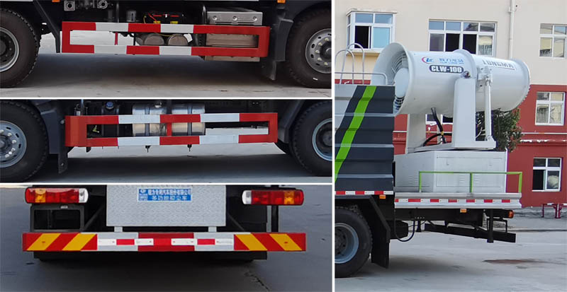 该车专用装置为抑尘雾炮,主要用于城市抑尘;整车长度/前悬/轴距/后悬/后伸的对应关系为(mm):9500/1430(1500)/3200+1350/2800(2730)/720,9500/1430(1500)/3175+1400/2775(2705)/720,10100/1430(1500)/3800+1350/2800(2730)/720,10100/1430(1500)/3775+1400/2775(2705)/720,10400/1430(1500)/4100+1350/2800(2730)/720,10400/1430(1500)/4075+1400/2775(2705)/720,10600/1430(1500)/4300+1350/2800(2730)/720;防护材料:Q235B碳钢,连接方式:左右侧面防护与副梁采用焊接连接,后下部防护与车架采用焊接连接,后部防护断面尺寸(mm):150?0,后部防护离地高度(mm):480;ABS系统控制器生产企业/型号为威伯科(上海)管理有限公司/4460046300;随底盘选装驾驶室,选装限速装置,限速89;该车罐体长卓碜高为(mm):4500?480?600,罐体总容量11.34立方米,罐体有效容积为10.80立方米; 选装雾炮外观样式. |