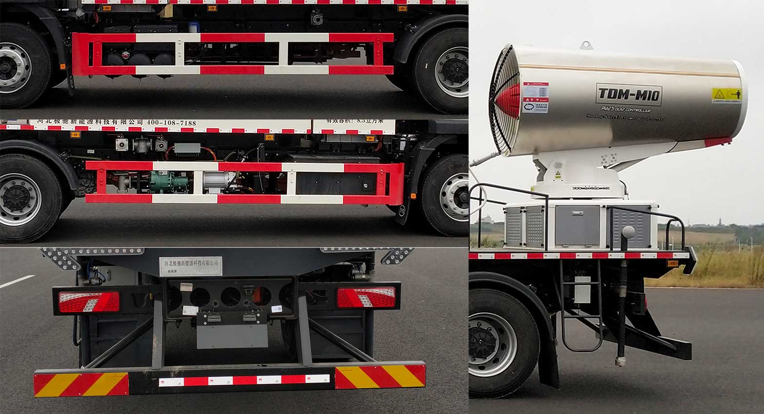 | 1.该车专用装置为喷雾系统装置、水箱、气控系统等,主要用于道路或固定场所除霾降尘作业;2.罐体有效容积8.5立方米,罐体外形尺寸(长卓碜高)(mm):(上边长2295,下边长3240)?300?850;3.侧、后防护材料均为:Q235,螺栓连接,后防护截面尺寸宽赘?mm):60?60;离地高度:380mm;4.动力蓄电池种类:磷酸铁锂蓄电池,生产企业:深圳市比亚迪锂电池有限公司(单体),汕尾比亚迪汽车有限公司(总成);驱动电机类型/生产企业:永磁同步电动机/长沙市比亚迪汽车有限公司,额定/峰值功率(kW):115/140;5.ABS型号生产企业:ABS-E/威伯科汽车控制系统(中国)有限公司;6.安装有卫星定位的行驶记录仪;7.该车型可选装不同样式的喷雾装置,前部鸭嘴,对冲冲水装置,随底盘选装前下防护装置和铝合金轮毂.8.整车长度与后伸对应关系(mm):8670/0,8970/300,9270/600,9520/850. |