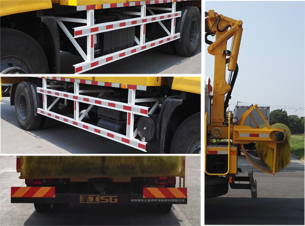 该车在侧部及后部粘贴反光标识;该车为专用作业车,侧下部防护装置采用Q235普通钢材制作并与车架大梁、上装采用螺栓连接,后防护离地高度为500mm。前伸200mm。ABS型号:3631010-C2000,生产厂家:东风电子科技股份有限公司制动系统分公司。可选装1:护栏清洗机,前伸:1600mm,整车尺寸:10590?496?930,整备质量:12000kg,额定载质量:3605kg:可选装2:辅助支撑轮,整备质量:11950kg,额定载质量:3655kg. |