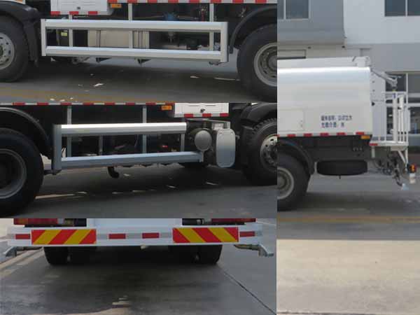 仅选用轴距4300+1350mm.随底盘选装驾驶室,选装翼子板,选装遮阳罩,可不选装玻璃后风窗.ABS系统型号为4460046300,生产企业为威伯科汽车控制系统(中国)有限公司.罐体外形尺寸(长轴锥讨嶙罐长)(mm) : 2180?420?500,有效容积13.07立方米,介质名称:水,介质密度:1000千克/立方米.选装车前无冲洗装置,该车型工作装置有2种配置:A(车前有冲洗装置),B(车前无冲洗装置).配置情况:A:长10515mm,前悬2290mm,接近角13?B:长9655mm,前悬1430mm,接近角19?侧面防护装置材质为铝合金,后下部防护装置的材料材质为Q235钢,连接方式均为螺栓连接,后下部防护装置的断面尺寸为175?5mm,其最大离地高度为520mm. |