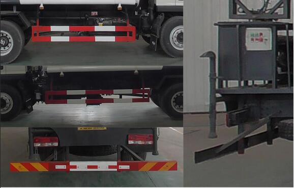 随底盘选装新造型前格栅.选装前部LOGO,选装新款保险杠、新造型前雾灯;选装雾炮样式;罐体有效容积9.87立方米,罐体尺寸:4800?200?400(mm);ABS型号为CM4XL-4S/4M,生产厂家为广州瑞立科密汽车电子股份有限公司;侧防护材料Q235,连接方式焊接连接,后防护材料Q235,焊接连接,后防护截面高度尺寸130mm,截面宽度尺寸50mm,下边缘离地高度480mm; 该车主要装置是罐体和喷雾机,用于降低空气中的灰尘,雾霾等现象. |