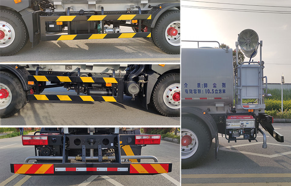 该车专用装置为水罐、水路及抑尘装置,主要用于道路、广场或固定场所除霾降尘等作业;仅选用3950mm轴距,罐体有效容积10.5立方米,罐体外形尺寸(长轴锥讨嶙长度mm):2400?420?000;随底盘选装驾驶室;选装限速装置,限速89;选装罐体涂装外观、前鸭嘴、对冲、后对冲、右侧进水口、尾部自吸,该系列选装对于整车尺寸、重量变化可忽略不计;侧面防护与后防护装置材质均为Q355,连接方式均为螺栓连接;后防护装置的断面尺寸为180?0mm,离地高度为460mm;ABS系统型号/生产厂家:J ABS/焦作博瑞克控制技术有限公司,ABS/ASR-24V-4S/4M/襄阳东风隆诚机械有限责任公司. |