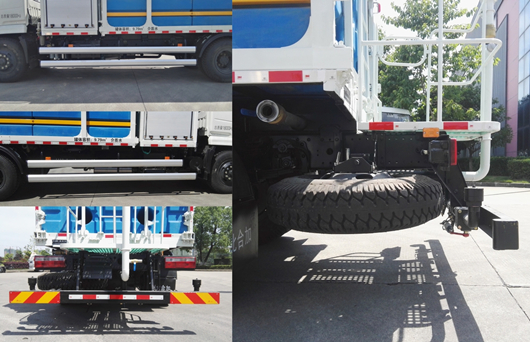 选用5100mm轴距底盘,随底盘选装驾驶室前脸以及保险杠,装有ABS,ABS的型号可以为ABS-E 4S/4M,生产厂为威伯科汽车控制系统(中国)有限公司,也可以为3631010-C2000,生产厂为东科克诺尔商用车制动系统(十堰)有限公司.该车型工作装置有2种配置:A(前喷架),B(护栏清洗装置);A,B配置前伸量均为1200mm,罐体外形尺寸(长卓碜高)(mm):3880?360?565(由4块长方形高密度聚乙烯材质罐体组成,单个罐体外形长970mm),罐体有效容积:9.79立方米;运输介质:水,密度1000千克/立方米;侧面防护装置的材料为铝合金,连接方式为螺栓连接;后防护装置材料为Q235A,连接方式为螺栓连接,断面尺寸为140?0mm,离地高度为500mm,仅选用10.00-20 18PR,10.00R20 18PR,11.00-20 16PR,11.00R20 18PR型轮胎;可选装前冲,鸭嘴,后箭头指示灯,后部下喷雾,左,右花洒等装置;专用装置由清洗装置,前喷装置,护栏清洗装置及罐体等组成,专用功能为道路清洗,保洁,护栏清洗等作业;罐体外观颜色及文字喷涂位置可变化. |