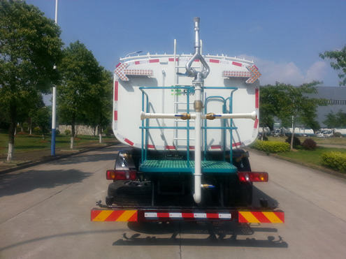 选用5000mm轴距底盘,驾驶室前脸扰流罩为选装件.选装前雾灯.选装卧铺侧窗装饰板,装有ABS,型号:3631010-C2000,4460046440;生产厂家:东科克诺尔商用车制动系统(十堰)有限公司,威伯科汽车控制系统(中国)有限公司.该车型工作装置有4种配置:A(前喷架),B(前喷架+升降平台),C(护栏清洗装置),D(护栏清洗装置+升降平台);各配置外形尺寸长/高/前伸/额定载质量/整备质量对应关系:配置A:9930/3000/1200/9390/8415,罐体外形尺寸(长度壮ぶ嶙短轴)(mm):4080?280?470,有效容积:9.859立方米;配置B:9930/3250/1200/8880/8925,罐体外形尺寸(长度壮ぶ嶙短轴)(mm):3850?280?470,有效容积:9.324立方米;配置C:10030/3000/1300/9390/8415,罐体外形尺寸(长度壮ぶ嶙短轴)(mm):4080?280?470,有效容积:9.859立方米;配置D:10030/3250/1300/8880/8925,罐体外形尺寸(长度壮ぶ嶙短轴)(mm):3850?280?470,有效容积:9.324立方米;运输介质:水,密度1000千克/立方米;侧面防护装置的材料为铝合金,连接方式为螺栓连接;后防护装置材料为Q235A,连接方式为螺栓连接,断面尺寸为140?0mm,离地高度为490mm,可选装前冲,鸭嘴,后箭头指示灯,后部上,下喷雾,左,右花洒,自吸和自吸管等装置;专用装置由清洗装置,前喷装置,护栏清洗装置,升降平台及罐体等组成,专用功能为道路清洗,保洁,护栏清洗等作业;罐体外观颜色及文字喷涂位置可变化. |