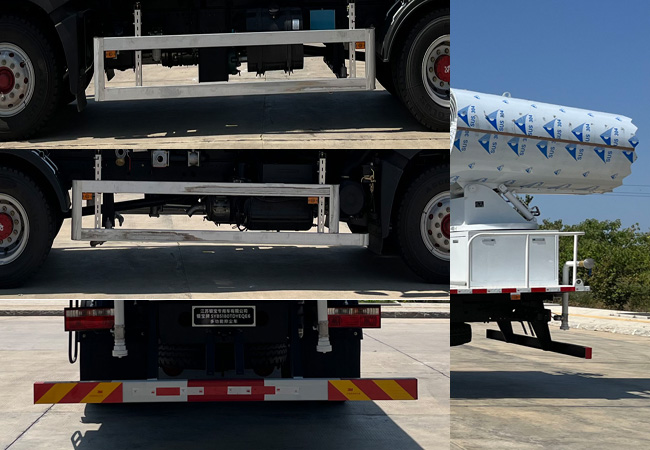 1,该车主要用于城市街道的喷雾抑尘,主要专用装置为喷雾总成;仅采用轴距(mm):4500.罐体总容量9.78立方米,罐体有效容积9.31立方米,罐体尺寸长卓碜高(mm):3150?400?650.加装前部智能水炮装置时:整车长/前伸/后伸对应关系为(mm):9940/610/730,9210/610/0;加装前部鸭嘴装置时:整车长/前伸/后伸对应关系为(mm):9510/180/730,8780/180/0;配置基本型时:整车长/前伸/后伸对应关系为(mm):9330/0/730,8600/0;选装后雾炮横置状态时:后伸为0mm;2.侧防护采用铝合金,螺栓连接;后防护采用Q235,螺栓连接,截面尺寸130?5mm,下边缘离地高度420mm;3.随底盘选装驾驶室.选装尾部雾炮样式.ABS系统生产厂家,型号 :焦作博瑞克控制技术有限公司,J ABS;襄阳东风隆诚机械有限责任公司,ABS/ASR-24V-4S/4M.选装限速装置,限速89km/h.尾部作业灯具仅在作业状态下使用。 |