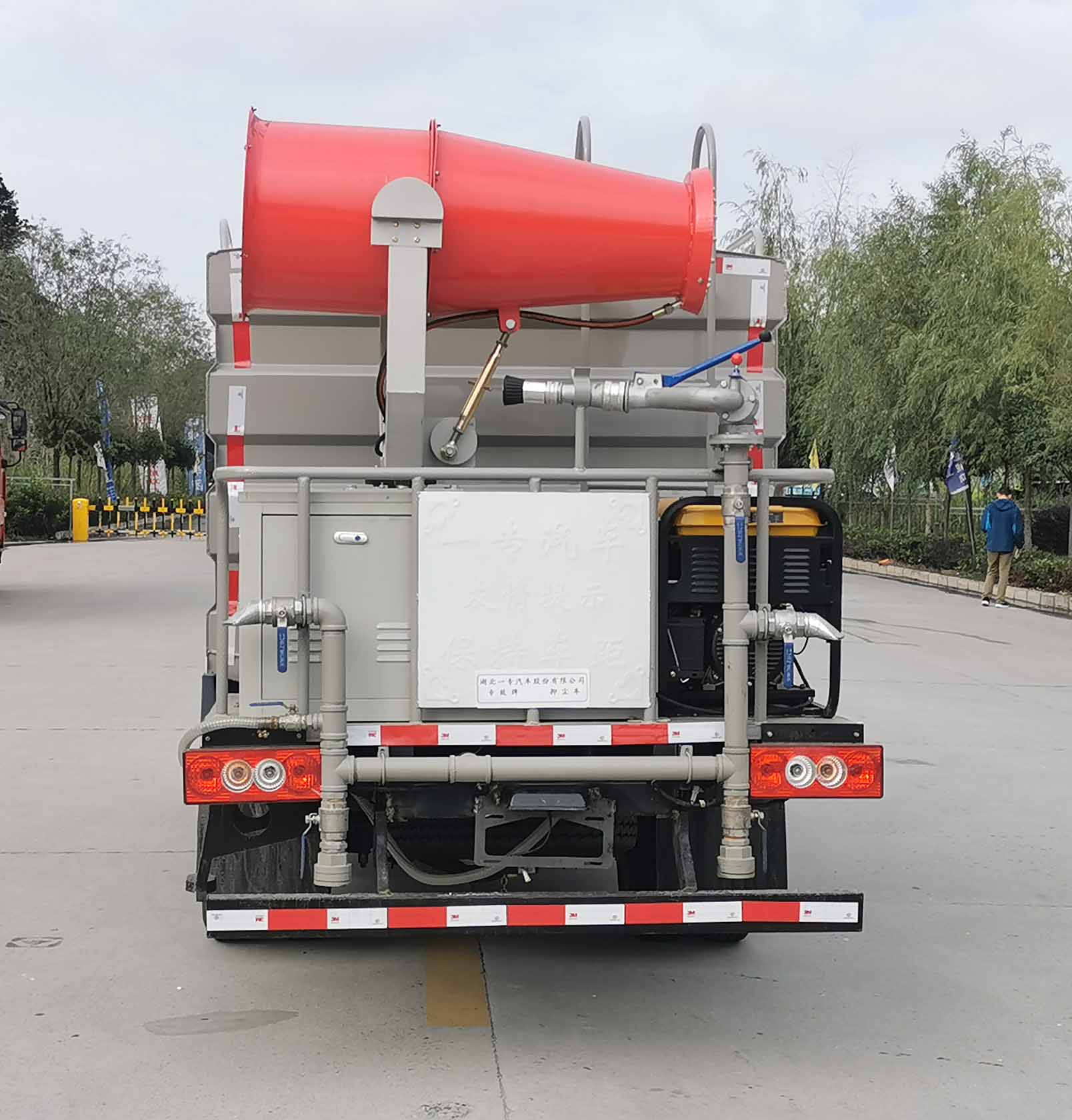 该车专用装置为抑尘雾炮,用于抑尘降霾,绿化及路面洒水,罐体尺寸(mm):2850?800?330,2650?800?180.运输介质为:水;整车总长/轴距/后悬对应关系为(mm):5720/2800/1105/1815,5950/3360/1105/1485,5720/2800/1115/1805,5950/3360/1115/1475,5720/2900/1105/1715,5720/2900/1115/1705;侧防护、后防护材料为Q235;侧、后防护连接方式均为焊接,后下部防护装置断面尺寸(宽赘?:50?00(mm),离地高度:400mm;ABS系统型号:ABS-VI.E;生产企业:广州瑞立科密汽车电子股份有限公司.ABS系统型号:ABS-E;生产企业:威伯科汽车控制系统(中国)有限公司;ABS系统型号:YF8;生产企业:武汉元丰汽车电控系统有限公司;选装厢板样式及结构,选装雾炮样式,选装罐体涂装外观,选装中对冲,选装液位汁,选装预留接口,选装顶部平台样式、罐口位置及其防护,选装雾炮及后平台样式.选装罐体样式(圆罐),选装后工作平台样式. |
