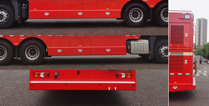整体式侧防护结构,后防护装置材料:Q235A,截面尺寸(宽赘?:125?96mm,与车辆连接方式:螺栓连接,后防护离地高度:455mm。EBS生产企业为WABCO,型号为EBS4+。作业时车厢两侧可扩展。主要专用装置有通信设备。车辆侧后面装有场地照明灯,仅作业时使用。 |