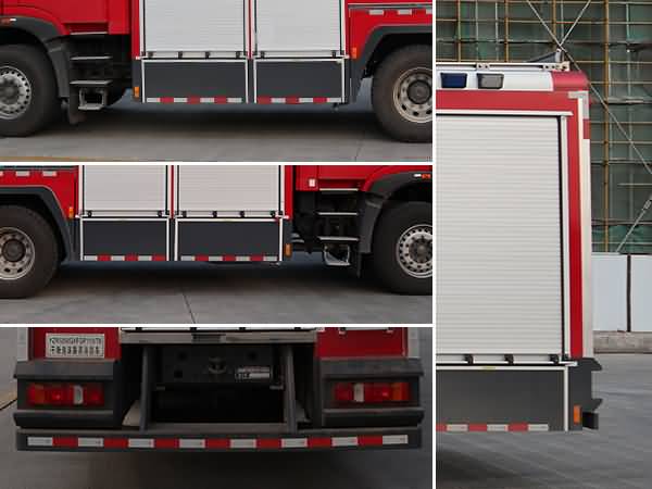 选装车辆尾部不带拉梯支架,随底盘布局选装外观样式.罐体总容积为11.061立方米,水罐容积:6.100立方米,水罐尺寸:1655?460?570mm,泡沫液罐容积:1.961立方米,泡沫液罐尺寸:530?460?570mm,干粉罐容积:3.000立方米,干粉罐尺寸(直径赘?:1828?507mm.整体式侧防护结构,后防护装置材料:Q235A,截面尺寸(宽赘?(mm):60?20,与车辆连接方式:螺栓连接,后防护离地高度:500mm.ABS生产企业为威伯科(上海)管理有限公司,型号为4460046300.主要专用装置有消防泵、消防炮、干粉系统。 |