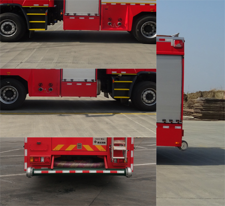 水罐容积:6.000立方米,水罐尺寸:2280?300?200mm。整体式侧后防护结构,后防护离地高度:375mm。ABS生产企业为浙江亚太机电股份有限公司,型号为APG3550500H1。主要专用装置有消防泵、消防炮。 |