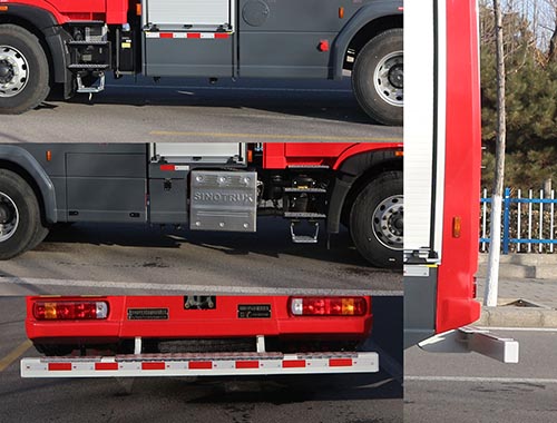 水罐总容积为7.800立方米,水罐尺寸:2320?350?500mm。整体式侧防护结构,后防护装置材料:Q235A,截面尺寸(宽赘?:80?20mm,与车辆连接方式:螺栓连接,后防护离地高度:460mm,ABS生产企业为威伯科(上海)管理有限公司,型号为4460046300。主要专用装置有消防泵、消防炮。 |