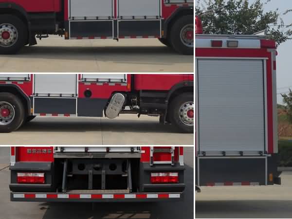 选装红色爆闪灯,罐体总容积为6.961立方米,水罐容积:5.000立方米,水罐尺寸:2630?400?420mm,泡沫液罐容积:1.961立方米,泡沫液罐尺寸:1030?400?420mm。整体式侧防护结构,后防护装置材料:Q235A,截面尺寸:60?20mm,与车辆连接方式:螺栓连接,后防护离地高度:495mm,ABS生产企业为襄阳东风隆诚机械有限责任公司,型号为ABS/ASR-24V-4S/4M。主要专用装置有消防泵、消防炮。后部拉梯为选装件。 |