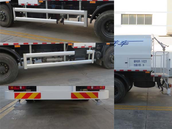 仅选用4500mm轴距.安装ABS,ABS型号:3631010-C2000,4460046440;生产厂家:东科克诺尔商用车制动系统(十堰)有限公司,威伯科汽车控制系统(中国)有限公司.随底盘选装驾驶室前脸扰流罩,选装前雾灯,选装卧铺侧窗装饰板.罐体外形尺寸(长轴锥讨嶙罐长)(mm) : 2186?456?020,有效容积9.9立方米,介质名称:水,介质密度:1000千克/立方米.选装车前无冲洗装置,该车型工作装置有2种配置:A(车前有冲洗装置),B(车前无冲洗装置).配置情况:A:长9140mm,前悬2275mm,接近角13?B:长8295mm,前悬1430mm,接近角20?选装Q235钢材料材质的侧面防护装置.车辆侧面防护装置的材料材质为铝合金(Q235钢),后下部防护装置的材料材质为Q235钢,连接方式均为螺栓连接,后下部防护装置的断面尺寸(mm)为175?5,其最大离地高度为460mm. |