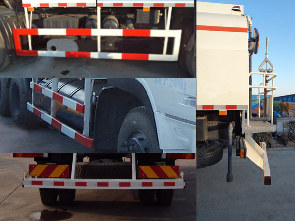 该车侧面,后部均安装有车身反光标识。1、运输介质为水,密度:1000千克/立方米,2、罐体有效容积:12.76立方米;3、罐体外形尺寸(长/长轴/短轴)(mm):5700/2300/1450;4、文字喷图位置和车辆颜色可变化;5、侧防护材料为Q345B,用螺栓连接;后防护材料为Q235A 100X100方管,与车架采用螺栓连接,后防护离地高度为480mm,6、仅选用轴距4350mm+1300mm,7、选装后部及外观样式。ABS的型号为ABS-E 4S/4M,生产厂家为威伯科汽车控制系统(中国)有限公司。该车已安装具有卫星定位功能的行驶记录仪。 |