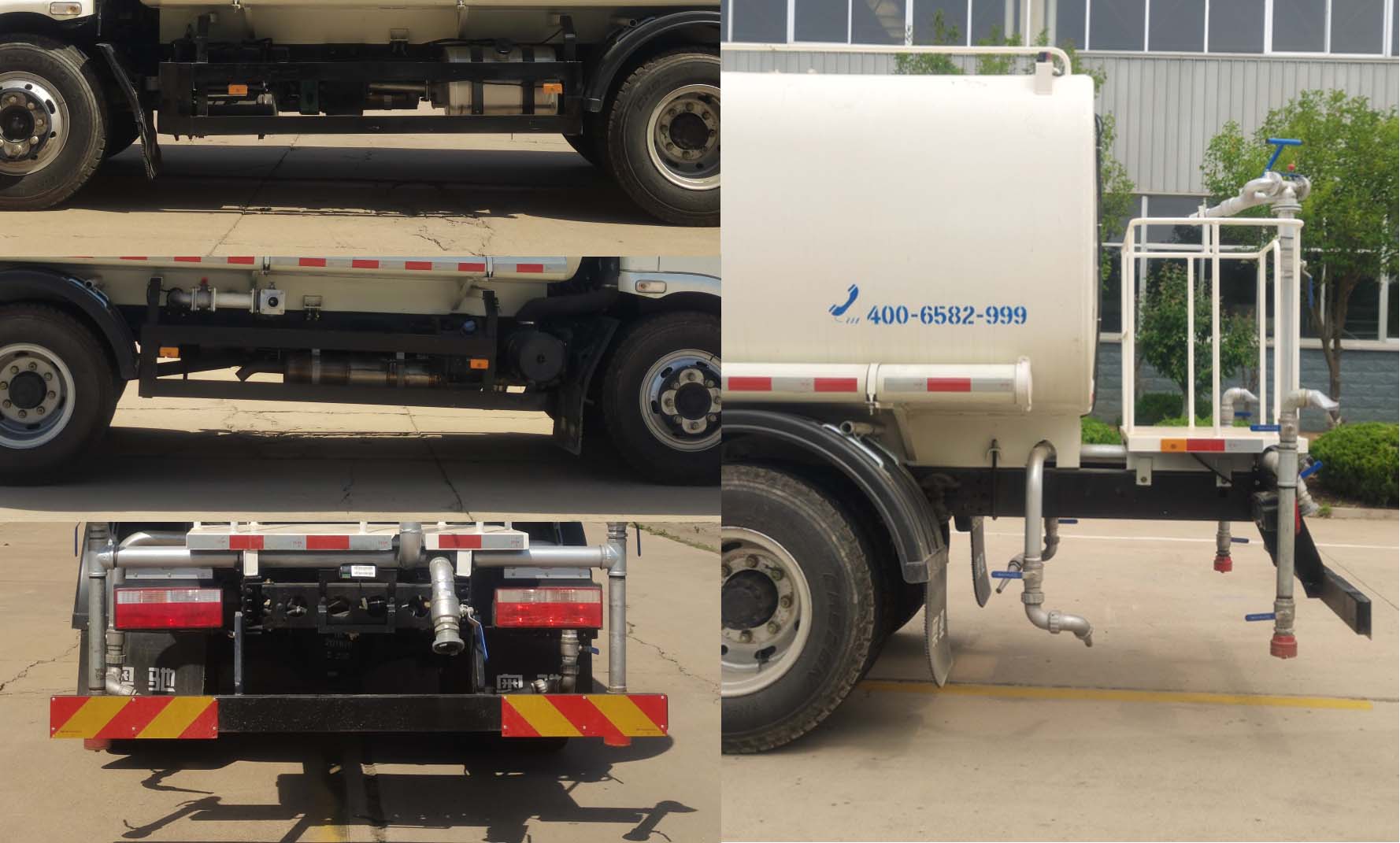 选装前围及前部灯具,选装镀铬中网.该车型可选装手动对冲及手动后洒,选装踏板,选装雾炮装置样式,发电机组.选装带雾炮时对应整备质量5583kg,额定载质量10222kg.该车主要用于路面洒水及园林绿化.主要专用装置为:罐体及水泵.罐体总容量为:11.25立方米,罐体有效容积:10.76立方米,运输介质:丙酮水溶液,介质密度:950千克/立方米,罐体外形尺寸(罐体长壮ぶ嶙短轴):4400?150?350.侧面及后下部防护装置材料为Q235A,连接方式:螺栓连接;后部防护装置截面尺寸为120?0,离地高度为490.安装带卫星定位功能的行驶记录仪.ABS型号为ABS-VI稥,生产厂家为广州瑞立科密汽车电子股份有限公司.所有尺寸单位mm.选装前鸭嘴装置. |
