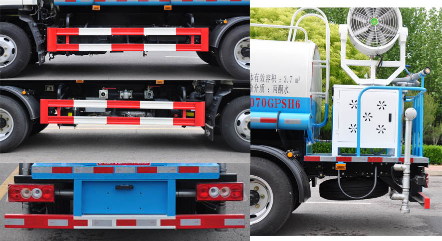 该车主要用于城乡园林绿化、喷洒等;主要装置为水罐.罐体总容量:3.89立方米,罐体有效容积:3.7立方米,介质:丙酮水溶液,罐体外形尺寸为(长壮ぶ嶙短轴)(mm):3180?580?100,侧、后防护装置材料材质为Q235,连接方式:左右侧面及后下部防护均采用螺栓连接,后部防护装置断面尺寸(宽赘?50?00(mm),后部防护离地高度:350mm.发动机Q23-115C60,Q28-130C60,Q23-115E60,Q28-130E60对应净功率分别为82kw,93kw,82kw,93kw.ABS系统控制器型号为CM4XL-4S/4M,ABS系统控制器生产企业为广州瑞立科密汽车电子股份有限公司.随底盘选装新款前格栅及Logo样式,该车选装后部无雾炮结构样式. |