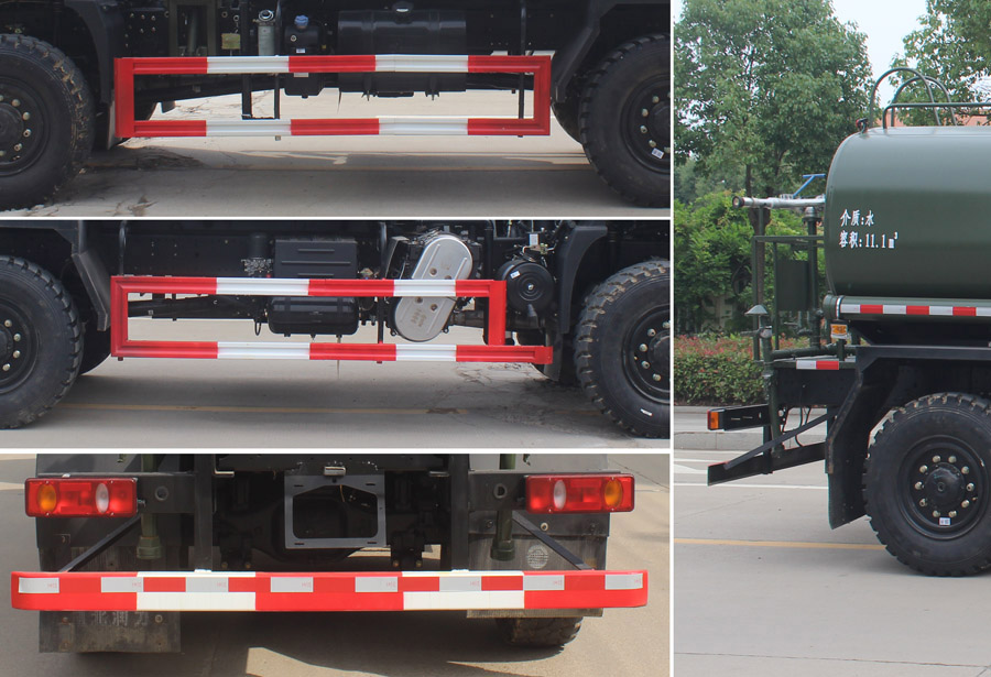 该车主要用于城乡园林绿化洒水,喷药等;主要装置为水罐及泵.随底盘选装驾驶室.罐体总容量11.1立方米,有效容积10.6立方米.整车长/前悬/后悬/轴距(mm)对应关系为:8500/1440/1660/4100+1300,8800/1440/1960/4100+1300.罐体外形尺寸(长壮ぶ嶙短轴)(mm)4600?350?400.侧、后防护材料为Q235B,侧防护与车架螺栓连接,后防护焊接连接.后部防护装置断面尺寸(宽赘?50?20(mm),后部防护离地高度:490mm. ABS型号:3631010-C2000;ABS生产企业:东科克诺尔商用车制动系统(十堰)有限公司.选装罐体颜色和后部工具箱样式。 |