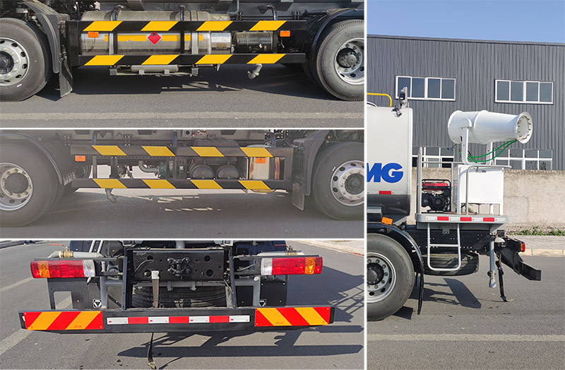 该车主要专用装置为水罐、水路及作业装置,用于城镇环境绿化,环卫清洁作业.罐体总容量14.66立方米,有效容积13.96立方米,罐体外形尺寸(长轴锥讨嶙长度)(mm):2440?550?400,介质为丙酮水溶液,密度为950千克/立方米.1、车辆无选装,长度9155mm,整备质量11300kg,后悬1930mm,接近角/离去角:14?15?2、选装前自动水炮,前伸525mm,长度9680mm,整备质量11300kg,后悬1930mm,接近角13?3、选装后部大平台,长度9680mm,整备质量11300kg,后悬2455mm,离去角13?4、选装后雾炮,长度9680mm,整备质量11600kg,后悬2455mm,离去角13?选装罐体涂装外观、鸭嘴、对冲、卷盘、护栏样式、顶部绿化浇灌、直喷雾管、中排冲、自吸进出水口、尾部上下喷雾、侧喷管、卷管架、不带尾部箭头灯、尾部压力放水口、预留接口,该系列选装对于整车尺寸、重量变化可忽略不计;侧防护与后防护装置材质均为Q355B,连接方式均为螺栓连接;后防护装置的断面尺寸为180?0mm,离地高度为450mm.ABS控制器型号/生产厂家:VIE ABS-II/浙江万安科技股份有限公司. |