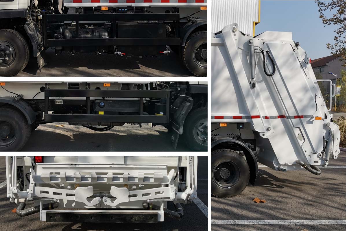 该车用于垃圾收集及压缩.有3种配置:A(选装后铲斗装置),B(选装提桶装置),C(选装提桶及后盖装置).配置A时,整车长6798mm,后伸268mm;配置B时,整车长6680mm,后伸150mm;配置C时,整车6680mm,后伸150mm.后下部车辆构件代替后防护,离地高度390mm.侧防护装置材料Q235,连接方式:螺栓连接,离地高度为540mm.随底盘选装新前格栅及logo.发动机型号:WP3NQ160E61最大净功率114kW,油耗值为17.5L/100km.ABS型号为CM4XL-4S/4M,生产厂家为广州瑞立科密汽车电子股份有限公司. |