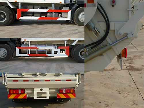 安装具有卫星定位功能的行驶记录仪.该车通过垃圾箱,填装机构等装置,达到垃圾收集装填及推挤卸料的作业功能.该车选装后填装器盖,,填装器上部可开启门.该车有3种配置:A(无上料装置,基本型),B(选装翻桶装置),C(选装翻斗装置).配置A时,整车长9896mm,后悬2796mm,整备质量15715kg,额定载质量9155kg(2人)或9090 kg(3人);配置B时,整车长10181mm,后悬2796mm,后伸285mm,整备质量15965kg,额定载质量8905kg(2人)或8840 kg(3人);配置C时,整车长10076mm,后悬2682mm,后伸294mm,整备质量16285kg,额定载质量8585kg(2人)或8520 kg(3人);侧面防护装置所用材料材质:Q235B,连接方式为螺栓连接;后下部防护由工作装置替代,工作装置离地高度为495mm.ABS系统控制器生产企业/型号为威伯科(上海)管理有限公司/4460046300;选装EBS,EBS系统控制器生产企业/型号为威伯科(上海)管理有限公司/EBS3。该车选用底盘4300+1350mm轴距.选装护栏外观。随底盘选装驾驶室灯具。选装左侧布置外观。选装后部警灯。选装多功能机械手及后部外观。选装前门结构型式。 |