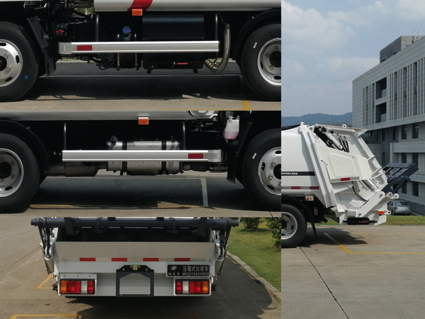 装置4种:A(翻桶装置1)、B(无选装装置)、C(翻桶装置2)、D(翻斗装置)。各配置整备质量(kg)/额定载质量(kg)/长(mm) /后伸(mm) 对应关系如下:配置A: 4280/1585/6175/560;配置B:4160/1705/5815/200;配置C:4435/1430/6175/560;配置D: 4435/1430/5975/360;侧防护装置的材料材质:铝合金,连接方式:螺栓连接;专用装置代替后部防护,离地高度350mm。ABS型号/生产企业:APG3550500A/浙江亚太机电股份有限公司。随底盘装JX4D30D6H发动机,对应油耗值(L/100Km)为12.08,随底盘选装组合尾灯。该车型可选装ETC车载装置。该车装备有垃圾箱体,液压机构及垃圾装填器,用于将垃圾自行压实装入,转运和卸料功能。 |