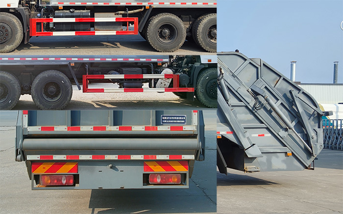 1、该车专用装置为箱体及压缩机构,用于城市环卫垃圾压缩及运输。2、侧防护材料Q235,螺栓连接,后部防护由专用装置代替,下边缘离地高430mm。3、仅选用轴距(mm):4350+1350;整车长/前悬/后悬/后伸的对应关系为(mm):10500/1515/2885/400,10300/1515/2885/200,10100/1515/2885/0,10500/1475/2925/400,10300/1475/2925/200,10100/1475/2925/0;ABS生产厂家:东科克诺尔商用车制动系统(十堰)有限公司,浙江万安科技股份有限公司,型号:3631010-C2000, VIE ABS-Ⅱ;该车安装具有卫星定位功能的行驶记录仪;选装ETC车载装置,发动机与油耗值对应关系为(L/100km):WP7.300E61/30.5,YCS06270-60/30.5 ,YCS06245-60/30.3,B6.2NS6B260/30.1,B6.2NS6B230/29.9,WP6H245E61/30.4,WP6H270E61/30.4,YCK05230-60/30.5,WP8.320E61/30.3,DDi75E300-60/30.5。4、随底盘选装驾驶室,选装后部装料机构样式。 |