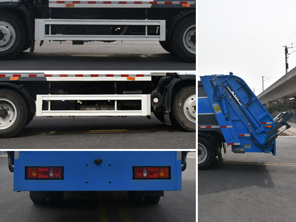 | 车辆主要专用装置为箱体和压缩机构,用于垃圾装载、压缩和运输.随底盘选装导流罩.选装驾驶室.选装驾驶室新风格装饰件及拉花.选装一体式后视镜.选装新款窄轮罩.选装后组合灯.选装气动密封盖.选装后部上料机构.选装尾部防尘盖.选装护轮板.选装箱体样式.选装空滤尿素罐、电瓶框、储气筒等部件安装位置的底盘布局.选装ETC车载装置.仅选用3800mm轴距.外形尺寸长/前悬/后悬/后伸(mm)对应关系为:7480/1220/2065/395,7510/1250/2065/395,7540/1280/2065/395,7200/1220/2065/115,7230/1250/2065/115,7260/1280/2065/115,7305/1220/2065/220,7335/1250/2065/220,7365/1280/2065/220.ABS型号及生产厂家为:3631010-C2000/东科克诺尔商用车制动系统(十堰)有限公司,J ABS/焦作博瑞克 控制技术有限公司.发动机/燃料消耗量(L/100km)为:YCY30165-60/19.7,D25TCIF1/20.1.车辆侧面防护装置的材料材质为Q235,连接方式为螺栓连接.后下部防护装置采用专用装置代替,最大离地高度为450mm. |