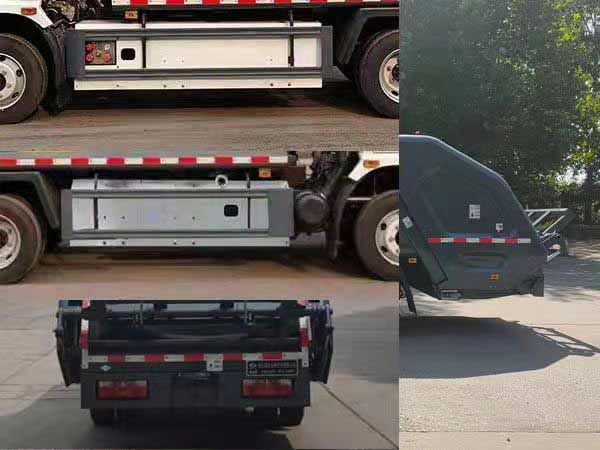 | 该车选用3390轴距.ABS型号:XC-ABS,ABS生产企业:襄阳市信诚电气有限责任公司.侧部防护装置材料为冷弯型钢/Q235B,侧部防护与车架连接方式为螺栓连接,后防护由专用装置代替,下边缘离地高480mm.选装方形或弧形车箱;选装箱体与驾驶室之间多路阀、液压油箱、液压管布置;选装箱体前端爬梯位置;选装多路阀罩;选装填装器外罩;选装后密封盖装置.选装不同工作装置时外形长/后伸(mm)对应关系:①无上料装置:6640/0,②摆臂装置:6790/150,③全密封斗装置:6790/150, ④半密封斗装置及⑤翻桶装置:7020/380.选装ETC车载装置,随底盘选装驾驶室.该车主要用于垃圾的收集与清运,主要专用装置为箱体,压缩系统等. |