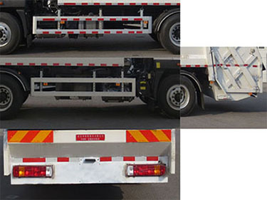 1.选装翻转架式提升机构后伸量为500mm,车总长为9110mm, 额定载质量为6870kg,整备质量为11000kg。2.选装料斗式提升机构后伸量为450mm,车总长为9060mm,额定载质量为6970kg,整备质量为10900kg。3.选装大臂式提升机构后伸量为290mm,车总长为8900mm,额定载质量为7110kg,整备质量为10760kg。4.侧防护装置所用材料为铝合金,与底盘纵梁螺栓连接;车身结构满足后防护的安装要求,离地高度为450mm。5.该车装置带卫星定位功能的行驶记录仪。6.ABS系统型号/生产企业对应关系:ABS-E/威伯科汽车控制系统(中国)有限公司;ABS/ASR-24V-4S/4M/东科克诺尔商用车制动系统(十堰)有限公司。7.仅选用4500mm轴距底盘。8.D6.7NS6B230型发动机油耗值为26.8。9.本车安装推板、厢体及后门,主要用于储存、装卸及运输垃圾。10.随底盘选装驾驶室。11.该车型可选装ETC车载装置。 |
