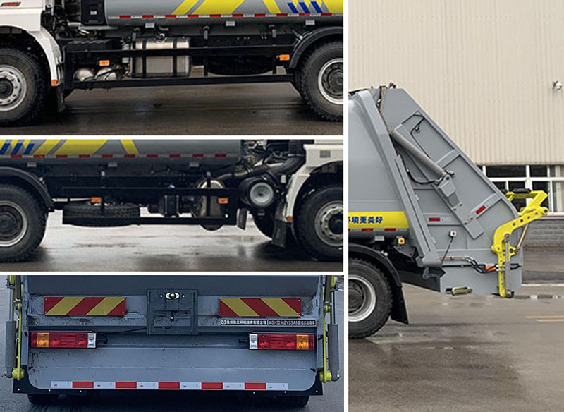 ABS型号:ZQFB-V;ABS生产企业:西安正昌电子股份有限公司;安装有具有卫星定位功能的行驶记录仪;选装描述:仅选用4375+1350,4375+1400轴距;选装后门,选装污水箱,选装垃圾箱造型.随底盘选装驾驶室前围,前保险杠外观.选装前部灯具,选装后视镜;该车可选装车载ETC装置;发动机/油耗值(L/100km)对应关系为:YCK08300-60/32.4;侧后防护情况:侧防护装置材质为铝合金或Q235B,连接方式为螺栓连接.后防护材质为专用装置替代,离地高度为440mm;专用功能及装置:该车装有垃圾箱、压填机构、液压系统等工作装置,用以收集、处理、转运垃圾.后伸:330mm. |