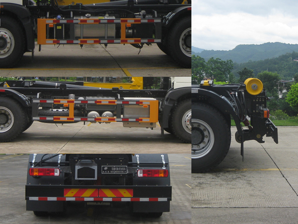 | 该车安装具有卫星定位的行驶记录仪,该车型可选装ETC车载装置;侧防护装置的材料材质:Q235B,连接方式为螺栓连接;后防护装置的材料材质:Q345B,连接方式为螺栓连接;后部防护装置的断面尺寸(宽赘?mm:60?40,后部防护装置的离地高度460mm;可选装铝合金材质侧防护、三联件、液压油箱、钩臂外观、电控箱;随底盘选装发动机型号/油耗值(L/100km)对应关系:MC07H.33-60/32.1、MC07H.29-60/32.1、MC07H.35-60/32.1、MC09.35B-60/32.0、MC09.35-60/32.0、MC09.38-60/32.0、WP8.350E61/32.0、MC11.40-60/32.2、MC07.31-60/32.1、MC07.27-60/32.1、MC07.34-60/32.1、WP10H400E62/32.1、WP9H350E62/32.2、MC11.40-61/32.1、MC07.29-60/32.4.随底盘可不选装遮阳罩,可不选装玻璃后风窗.ABS系统控制器生产企业/型号为威伯科(上海)管理有限公司/4460046300,选装EBS,EBS系统控制器生产企业/型号为威伯科(上海)管理有限公司/EBS3,随底盘选装限速装置,最高车速(km/h)为80或89.该车主要由液压控制系统控制专用吊臂的起吊、拉装工作,从而实现放置在地面的装载有生活垃圾的垃圾箱体的转运功能. |