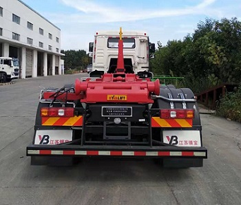 | 1.ABS系统控制器生产企业/型号为:西安正昌电子股份有限公司/ZQFB-V;2.侧面防护装置的横杆材料为铝合金,螺栓连接,离地高度为460mm;后下部防护装置的横梁材料为Q235A,螺栓连接,断面尺寸为120mm?20mm,离地高度为480mm;3.选装描述:该车可选装铝合金挡泥罩,选装装配式的拉臂上装;选装上述装置时引起的整备质量变化不超过3%;驾驶室后部可选装空滤器;4.该车可选用的发动机型号和对应的油耗值分别为:YCS06270-60/31.22(L/100km)、WP7.270E61/32.37(L/100km)、WP7.300E61/32.37(L/100km);5.该车安装具有卫星定位功能的行驶记录仪;6.该车通过专用装置拉臂系统来实现垃圾的转运. |