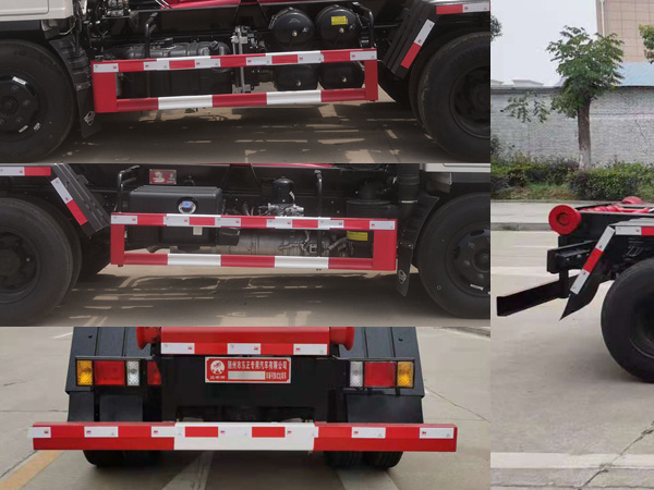 选装大臂结构,后部液压支撑,固定锁紧,液压锁紧,横向锁紧;专用装置为勾臂,用于垃圾的收集及转运.侧防护采用Q235材质螺栓连接,后防护采用Q235材质焊接连接,后防护截面尺寸(mm):120?0,下边缘离地高度400mm;ABS系统控制方式为:4S/4M,ABS型号为:CM4XL-4S/4M,生产厂家为:广州瑞立科密汽车电子股份有限公司;发动机/油耗值(L/100km)对应为:Q23-115C60/11.32;仅选用2800mm轴距;该车型可选装ETC车载装置.选装不同的勾臂样式.整备质量包含备胎,灭火器,随车工具等. |