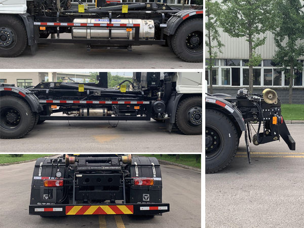 ABS型号:VIEABS-Ⅱ,ABS生产企业:浙江万安科技股份有限公司;安装有具有卫星定位功能的行驶记录仪;选装描述:随底盘选装驾驶室,选装电控盒位置,该车可选装直接供电车载ETC装置.仅选用4500mm;侧后防护情况:侧防护装置材质为Q235B,选装铝合金材质,连接方式为螺栓连接.后防护材质为Q345B,断面尺寸为180mm?0mm,离地高度为400mm;专用功能及装置:该车主要通过拉臂装置及其液压系统,对垃圾箱箱体进行拉箱上车、举升卸料、卸箱下地等动作,并能对垃圾箱箱体进行转送运输的功能. |