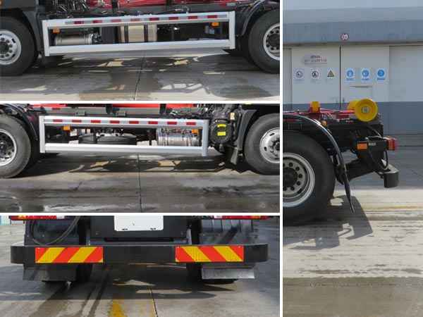 车辆主要用于城乡垃圾的收集、中转和运输,专用装置为装卸功能的拉臂钩.仅选用4500mm轴距.随底盘选装限速装置,最高车速80km/h或89km/h.选装前围.选装后封板.选装新式车辆外部标识牌.选装ETC车载装置.安装具有卫星定位功能的行驶记录仪.ABS系统型号/生产企业对应关系:ABS-E/威伯科汽车控制系统(中国)有限公司;ABS/ASR-24V-4S/4M/东科克诺尔商用车制动系统(十堰)有限公司;CM4XL-4S/4M/广州瑞立科密汽车电子股份有限公司;3550D-1010/东科克诺尔商用车制动系统(十堰)有限公司;EBS 5/克诺尔制动系统(大连)有限公司.车辆侧面防护装置的材料材质为铝合金,连接方式为螺栓连接.后下部防护装置的材料材质为Q235钢,连接方式为焊接,断面尺寸(mm)为80?60,最大离地高度为420mm. |
