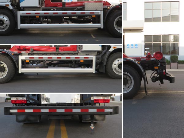 | 车辆主要用于城乡垃圾的收集、中转和运输,专用装置为装卸功能的拉臂钩.随底盘选装前面罩,前保险杠,前组合灯具,前雾灯.选装后视镜.选装新式车辆外部标识牌.选装ETC车载装置.ABS厂家及型号:襄阳东风隆诚机械有限责任公司/ABS/ASR-24V-4S/4M.车辆侧面防护装置的材料材质为铝合金,连接方式为螺栓连接.后下部防护装置的材料材质为Q235钢,连接方式为焊接,断面尺寸(mm)为80?60,最大离地高度为460mm. |