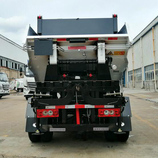 该车装有垃圾箱、液压系统、电气控制系统等工作装置,实现装载垃圾和倾翻卸料作业;侧防护装置材料为Q235A型材,连接方式为螺栓连接,后防护由专用装置代替,离地高度380mm;ABS系统控制方式为4S/4M,ABS型号为CM4XL-4S/4M,生产厂家为广州瑞立科密汽车电子股份有限公司.发动机Q23-115E60,Q23-115C60对应的油耗值分别为11.4L/100km,11.4L/100km.;选装新前格栅及新logo.选装新前围.,可选装采用直接供电方式的ETC车载装置.整备质量含备胎,不含灭火器及随车工具,货厢重量为645kg,货厢边板及顶板材料为Q355B,厚度3.0mm,货厢前板、后板、底板材料为为Q355B,厚度4.0mm,选装上料机构外观 |