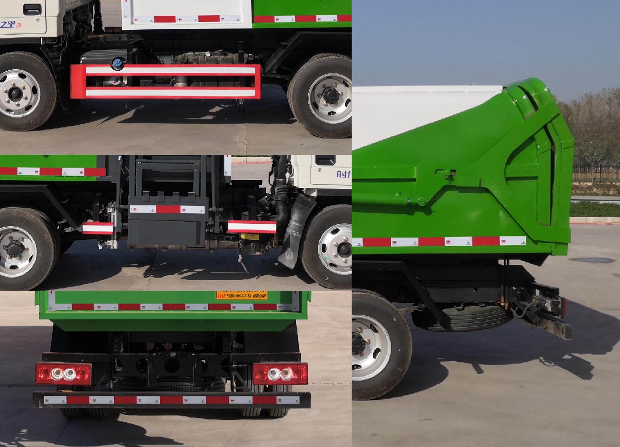 此车用于将垃圾倾倒在厢体内进行转运,专用装置为提升机构,推板机构等组成.自卸方式:后卸式.防护:侧后防护材料均采用Q235,与车辆连接方式为焊接.后防:离地高度为410mm,断面为120mmX50mm.ABS型号为CM4XL-4S/4M,生产厂家为广州瑞立科密汽车电子股份有限公司.发动机型号与油耗值对应关系为(L/100km):Q23-115E60/12.7;Q23-115C60/12.7.随底盘选装驾驶室.选装箱体样式和提升装置型式.整备质量包括备胎,灭火器及随车工具. |
