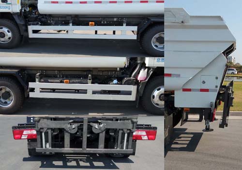 侧面防护装置为铝合金,采用的联接方式为螺栓联接;后防为专用装置代替,离地高度为420mm,ABS系统型号/生产企业对应关系为:VIE ABS-II/浙江万安科技股份有限公司,可选装限速装置,选装限速装置时对应最高车速为(km/h)80。选装尾灯安装位置,塑料挡泥板,翻桶机构,液压油箱移至箱体和驾驶室之间,发动机为JX4D306H,油耗值为14.5L/100km,该车用于市政环卫类的垃圾收集和转运,配置垃圾箱、翻桶机构等垃圾收集专用装置。随底盘扩展组合尾灯。选装厢体缩短结构,整备质量4680kg,载质量3325kg,长5880mm,高2450mm,后悬1395mm,离去角17度。 |