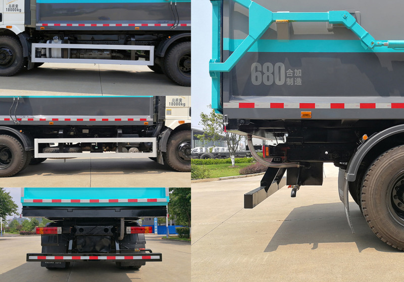 选用4500mm轴距底盘,装有ABS,ABS系统生产厂家:长春瑞立科密汽车电子有限公司,型号:CM4XL;车厢顶部封闭不可开启;侧防护材料为铝合金,连接方式:螺栓连接,后防护材质为Q235A,连接方式:螺栓连接,断面尺寸为140?0(mm),离地高度为460mm;发动机CA4DK1-22E6对应的油耗值(L/100km)为25.6;安装具有卫星定位功能的行驶记录仪;随底盘选装驾驶室前围和灯具,选装宽体保险杠脚踏板,选装驾驶室前脸无文字标识外观,专用装置主要由垃圾箱体、液压控制系统、摆杆机构等组成,用于实现与垃圾中转站对接、运输、倾卸压缩式垃圾块.驾驶室准乘人数为3人时,载质量为8825,准乘人数为2人时,载质量为8890,该车型可选装ETC车载装置,选装后门摆杆机构. |
