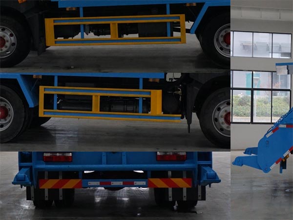 专用功能及装置:装备有可回转的起重摆臂,车斗悬吊在起重摆臂上,随起重摆臂回转起落,实现垃圾的装卸;侧防护材料为Q235,连接方式为连接支架固焊在副车架大梁上.后防护材料为Q235,连接方式:用螺栓结构连接件固焊在主车后端,后部防护装置断面尺寸(宽赘?45?20(mm),后部防护离地高度:460(mm).随底盘选装驾驶室.选装后部结构.选装限速装置,限速89.安装带卫星定位功能的行驶记录仪.ABS系统生产厂家,型号 :焦作博瑞克控制技术有限公司,J ABS;襄阳东风隆诚机械有限责任公司,ABS/ASR-24V-4S/4M.采用3950(mm)轴距底盘.选装ETC车载装置.发动机/油耗值(L/100km)对应关系为:B6.2NS6B210/26.1,D4.5NS6B220/26.3,D4.0NS6B195/26.4,YCS04200-68/26.5,CY4SK761/26.3,B6.2NS6B230/26.1,YCY30165-60/23.1. |