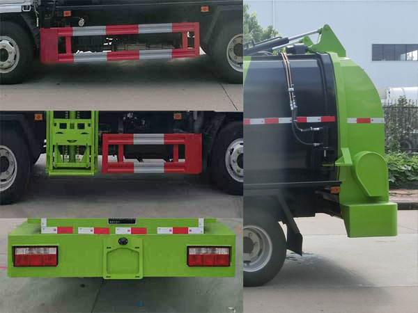随底盘选装驾驶室;选装箱体后部样式。侧防护采用冷弯型钢/Q235B,螺栓连接,后防护由车身结构替代,下边缘离地高450mm。ABS型号/厂家:ABS/ASR-12V-4S/4M/襄阳东风隆诚机械有限责任公司。该车用于餐厨垃圾收集运输,主要专用装置为箱体、上料机构、提升架。 |
