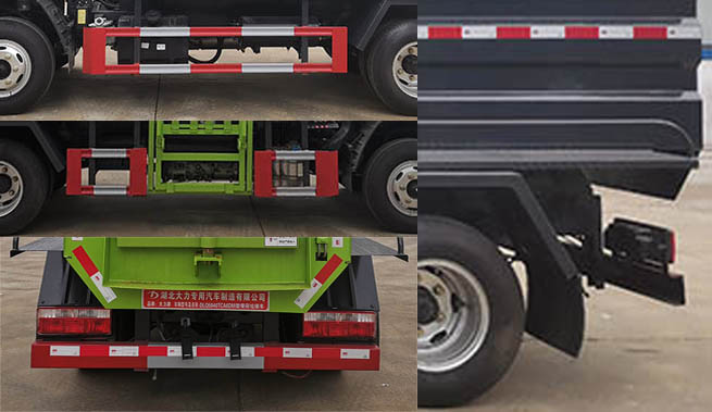 侧后防护材料:Q235碳钢,连接方式:左右侧面及后下部防护均采用焊接连接,后下部防护断面尺寸(mm):100?0,后下部防护离地高度(mm):400;3,ABS型号/厂家:ABS/ASR-12V-4S/4M/襄阳东风隆诚机械有限责任公司;4,主要专用装置为箱体、上料机构提升架,主要用于餐厨垃圾收集,转运及卸料作业.随底盘选装驾驶室外观样式. |
