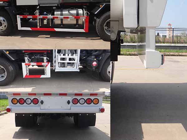 该车可选装清水箱、工作指示灯、爬梯、工具箱及室外控制盒、清洗系统卷盘器、清洗系统隔膜泵、接水槽装置.随底盘选装驾驶室.选装后防护装置结构,连接方式为螺栓连接,断面尺寸为120?0mm,离地高度为450mm.侧面防护装置所用材料材质:Q235B,连接方式为螺栓连接.后部防护装置所用材料材质:Q235B,连接方式为焊接连接,断面尺寸为178?0mm,离地高度为480mm.ABS系统型号为XH-KQ4S4M-E01,生产企业为广州市西合汽车电子装备有限公司;型号为CM4XL-4S/4M,生产企业为广州瑞立科密汽车电子股份有限公司。专用装置:齿轮泵、液压缸、机械手等,通过齿轮泵及液压系统,驱动机械手提升餐厨垃圾桶,实现收集餐厨垃圾功能.选装右侧无观察窗型式.选装新款后门结构型式,对应整车长度5720mm,选装防飞溅型式,选装油箱、工具箱外观型式,选装侧防护支架外观型式。 |