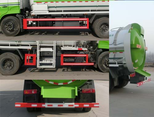 随底盘选装驾驶室;选装垃圾箱外观。ABS型号/生产厂家:3631010-C2000/东科克诺尔商用车制动系统(十堰)有限公司,ABS 8/东科克诺尔商用车制动系统(十堰)有限公司, 4460046450/威伯科汽车控制系统(中国)有限公司,J ABS/焦作博瑞克控制技术有限公司。侧面防护采用冷弯型钢/Q235-B,螺栓连接;后防护采用冷弯型钢/Q235-B,螺栓连接。后防护截面高度尺寸120mm, 截面宽度尺寸50mm,下边缘离地高度450mm。该车用于餐厨垃圾收集清运,主要专用装置为箱体、上料机构提升架。随底盘选装排气管样式. |